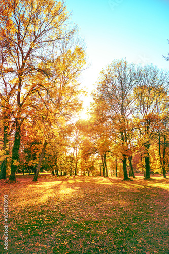Naklejka premium orange and red fall leaves in sunny park, autumn natural vertical background