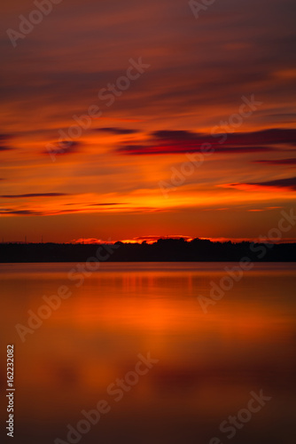 © Grigorii Postnikov, Fototapeta premium Orange and red sunset at coast of the lake