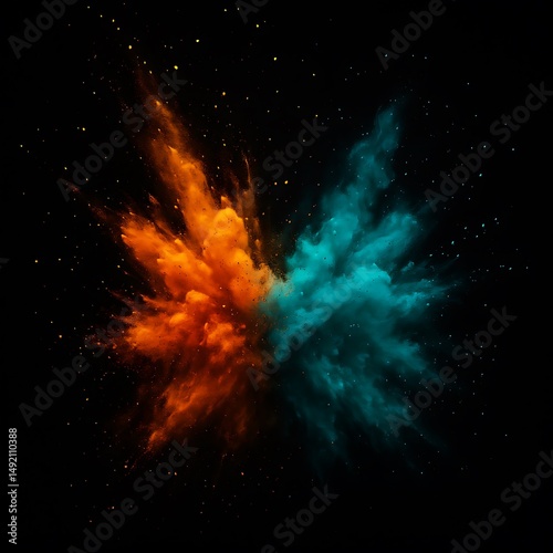 © khadiza474, Naklejka premium Orange and teal powder explosion on black background