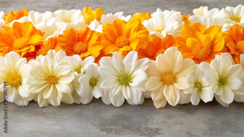 © Ilja, Fototapeta premium Orange And White Chrysanthemums And Calendula Flowers Arranged In Row On Gray Concrete Background