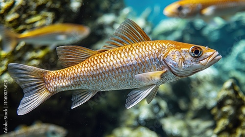 © JOKO STUDIO, Fototapeta premium Orange and white fish swims in clear water, surrounded by rocks and other fish