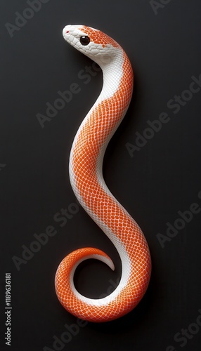 Fototapeta premium Orange and white snake coiled on black background. Striking scales and elegant posture.