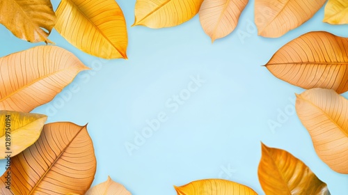 © habib, Fototapeta premium Orange and Yellow Leaves Frame on a Light Blue Background
