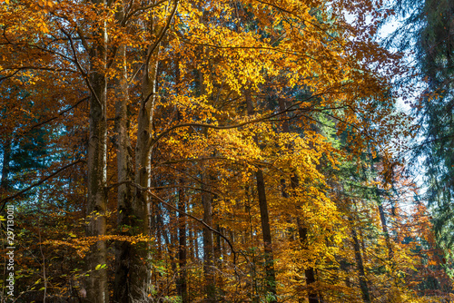 © Alpar, Fototapeta premium Orange beech leaves on the tree at autumn in the deciduous forest.