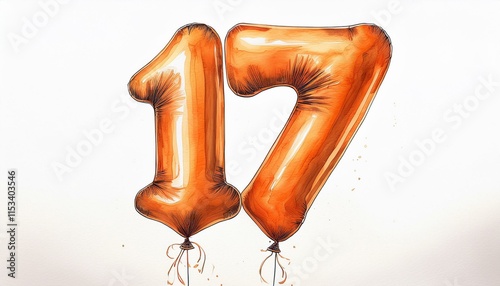 Naklejka premium Orange birthday / anniversary balloon, number 17, watercolor painting with...