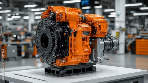 Fototapeta premium Orange, black car engine; detailed manufacturing environment in background