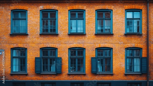 © arsyi_06, Fototapeta premium Orange brick building facade with teal windows and shutters.