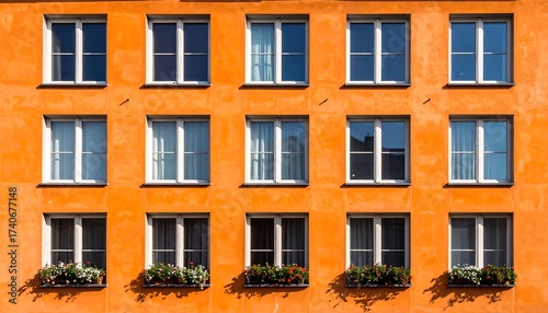 © faisal, Fototapeta premium Orange Building Facade with Symmetrical Window Arrangement.