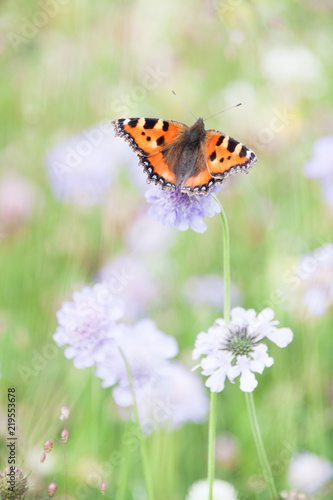 © Angelina Cecchetto, Obraz premium Orange Butterfly Gathering Pollen of Purple Flowers in Green Field