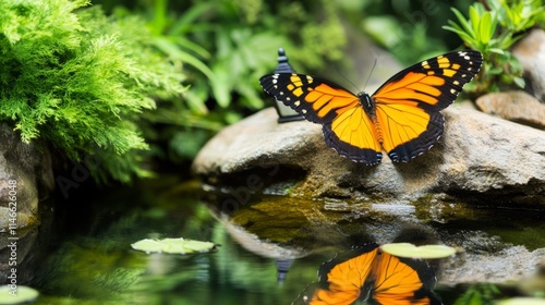 Naklejka premium Orange Butterfly Near Tranquil Water Garden