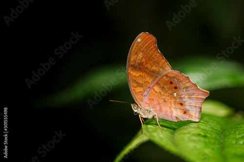 Obraz premium Orange butterfly on a leaf in a green background