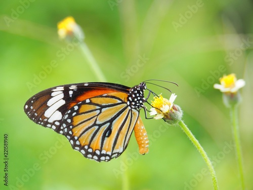© Thongchai, Fototapeta premium Orange butterfly on grass flower white yellow. Blur the natural background in green tones. In the concept of insects and poultry.
