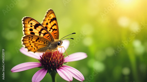 © Natalia, Obraz premium Orange butterfly on purple flower in sunny garden