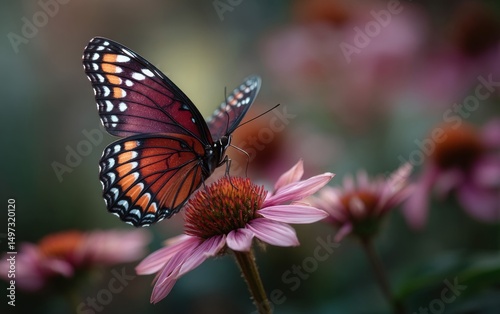 © Fomo Creative, Obraz premium Orange Butterfly on Purple Flower Macro Photography