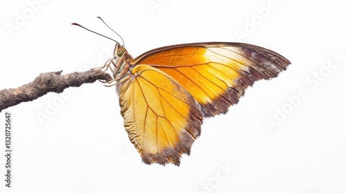 © NAIMAH, Obraz premium Orange butterfly perched on a twig, wings slightly damaged, isolated on white