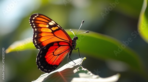 Obraz premium Orange butterfly resting on a green leaf surface