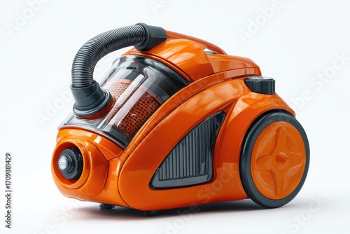 © Yasfar, Fototapeta premium Orange canister vacuum cleaner, angled view, against white background
