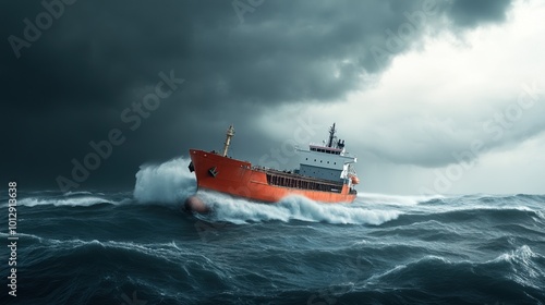 © Phirakhup, Naklejka premium Orange cargo ship navigating turbulent seas under dark storm clouds.