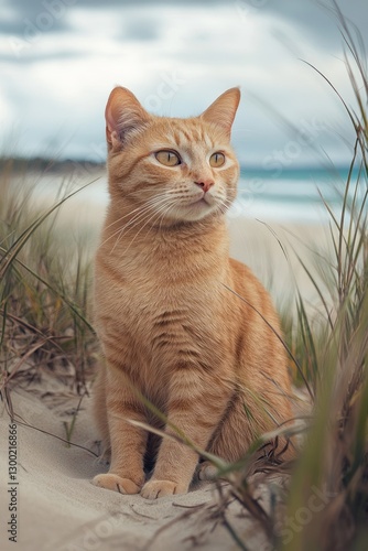 Obraz premium Orange cat beach dune grass ocean