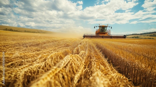 Naklejka premium Orange Combine Harvester Working in a Field of Wheat