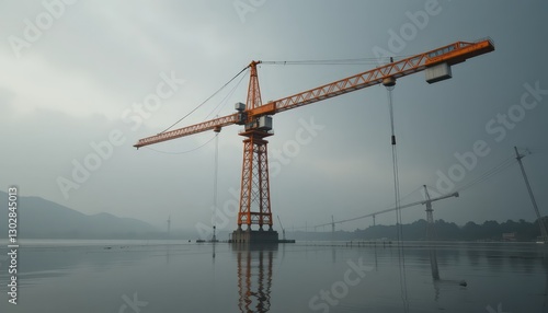 © Aryazu, Fototapeta premium Orange Crane by the Lake: A Construction Site's Serene Reflection