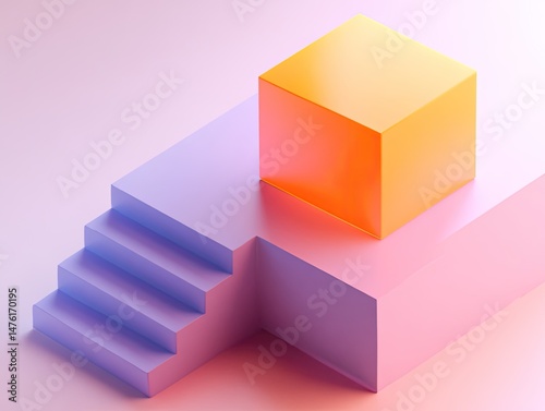 Obraz premium Orange cube atop purple platform & stairs