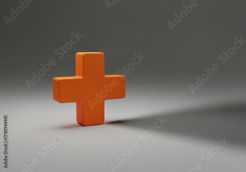 © baasith88, Obraz premium Orange 3D Plus Sign Standing on Gray Surface with Soft Shadow, Minimalist Cross Symbol in Modern Lighting