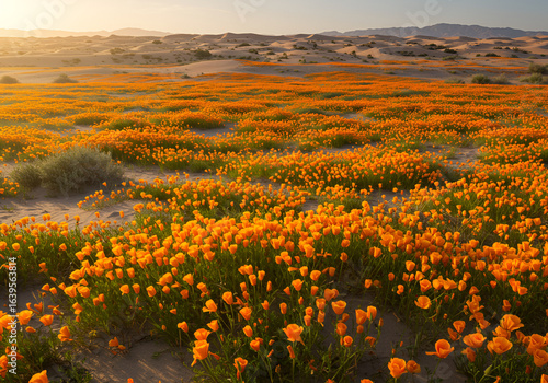 © Abdullah, Fototapeta premium Orange Desert Wildflowers Blooming After Rainfall in Arid Landscape