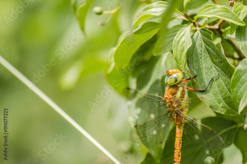 Fototapeta premium Orange dragonfly on a green plant