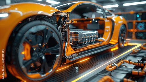 © MUCHIB, Fototapeta premium Orange Electric Sports Car on Assembly Line
