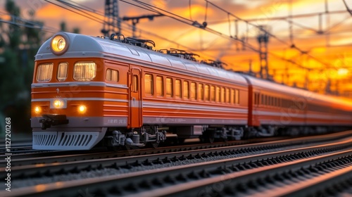 © Zoro, Obraz premium Orange electric train model at sunset.