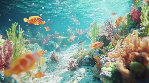 Fototapeta premium Orange fish swim among colorful coral and seaweed in a sunny underwater scene. Perfect for aquarium, marine life, or nature documentaries.