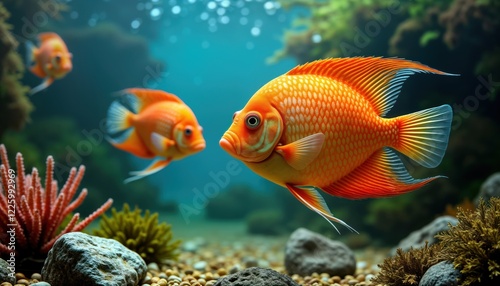 Fototapeta premium Orange fish swim in aquarium tank among corals, plants. Aquarium water clear. Rocks, gravel visible on bottom. Fish colorful, healthy looking. Freshwater aquatic pet home. Relaxing view of fish. Fish