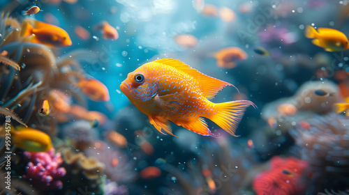 © KALEYA, Fototapeta premium Orange Fish Swimming in Blue Water with Coral Reef Illustration