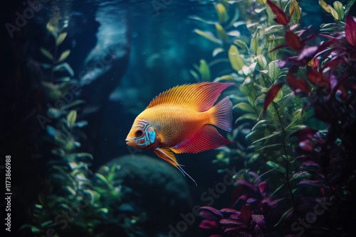 © jambulart, Fototapeta premium Orange fish swims among underwater plants.