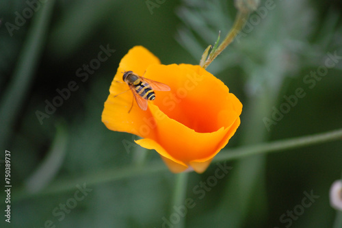 © Олег Спицын, Fototapeta premium orange flower with striped fly on blurred green background