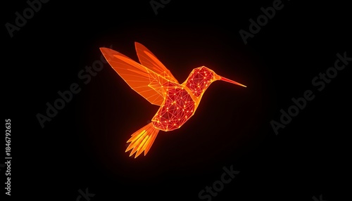 © MDMAHBUBUR, Naklejka premium Orange geometric hummingbird with glowing lights on black background polygonal low poly