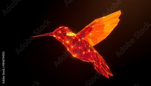 © MDMAHBUBUR, Naklejka premium Orange Geometric Hummingbird with Wireframe Structure Flying on Black polygon low poly