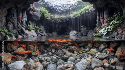 © Hari, Fototapeta premium Orange Goldfish in a Lush Underwater Cave Aquarium