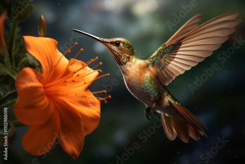 Fototapeta premium Orange Hummingbird Close-Up with Emerald Jungle Backdrop