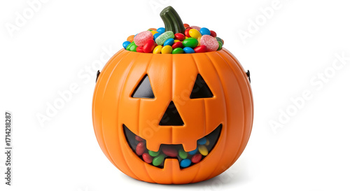 Fototapeta premium Orange jack o lantern bucket overflowing with colorful halloween candy treats