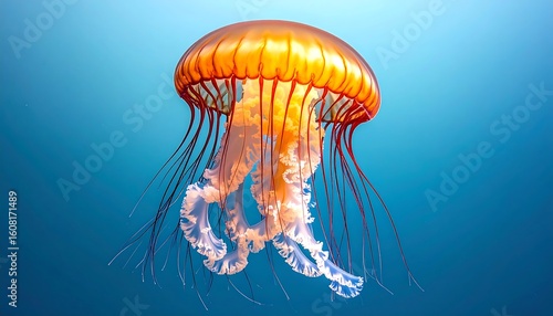 © desain, Fototapeta premium Orange jellyfish, bell and tentacles, underwater