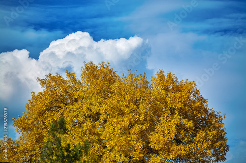 © Alrandir, Fototapeta premium orange leaves against cloudy sky