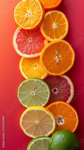 © Fleuronica, Obraz premium Orange, lemon, lime; grapefruit citrus slices on pink background; top view