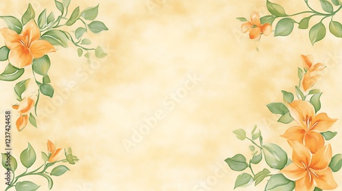 Obraz premium Orange Lilies and Green Leaves Frame a Pale Yellow Background