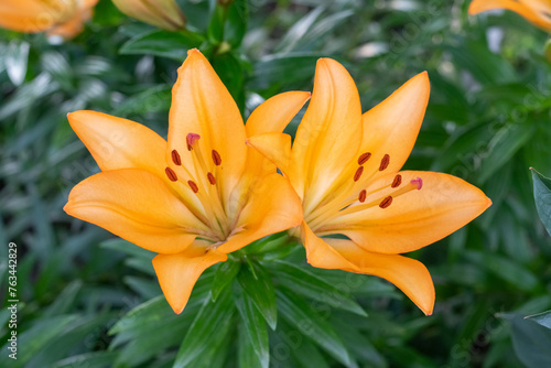 © Volodymyr, Fototapeta premium Orange lilies in a flower garden close-up