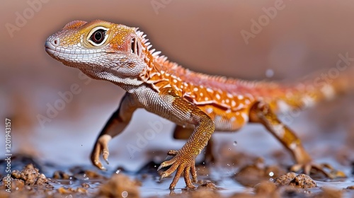 © tugkiara, Naklejka premium Orange lizard walking in puddle, arid background, wildlife photography, nature