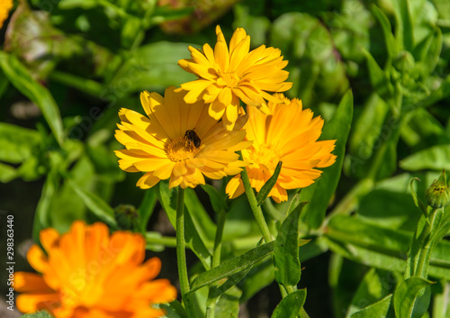 Fototapeta premium Orange marigold flower with a sitting bee on a bright sunny day