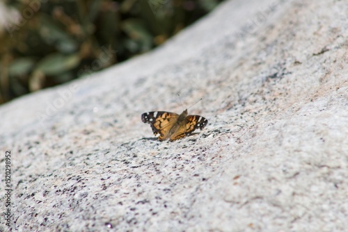 Fototapeta premium Orange Monarch Butterfly in the wild on rock at Tahquitz peak in Idyllwild...
