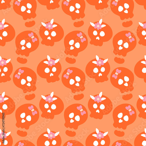 Obraz premium Orange Monochrome Skulls with Flowers Vector Seamless Pattern